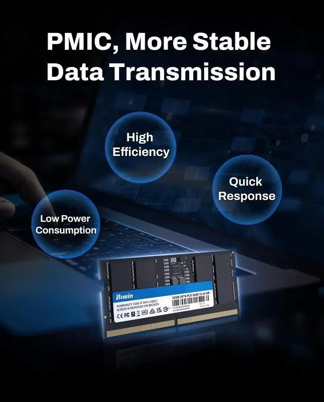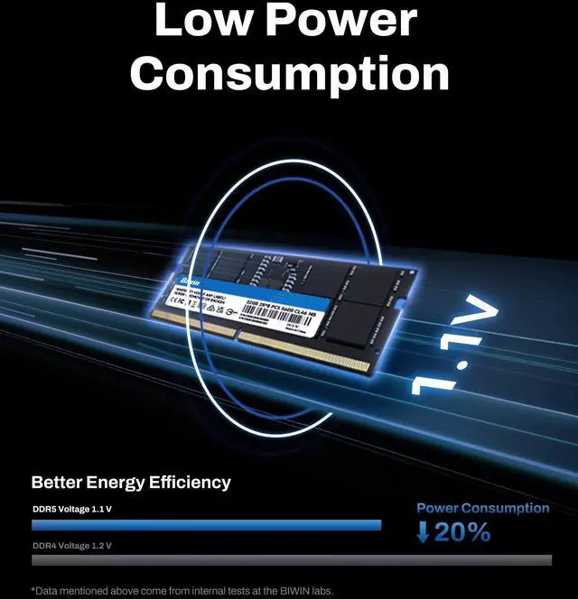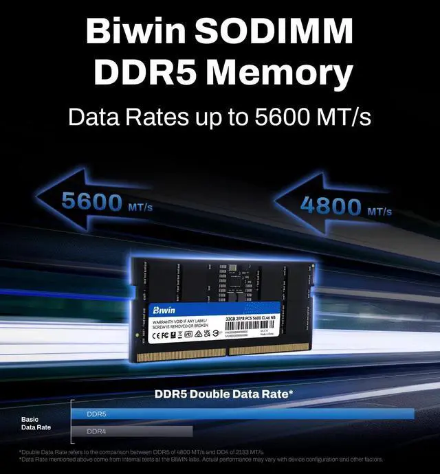 Compatible with mainstream DDR5 laptops and mini PCs (NUCs), Biwin DDR5 SODIMM features a smaller outline and thickness than standard DIMM modules. With data rates up to 5600 MT/s, Biwin brings the new DDR5 technology in BIWIN DDR5 SODIMM to let you work faster, run more applications simultaneously, and enjoy more capacity. On-Die ECC error correction and selected premium ICs allow the Biwin DDR5 SODIMM to bring more stable data transfers and higher reliability.