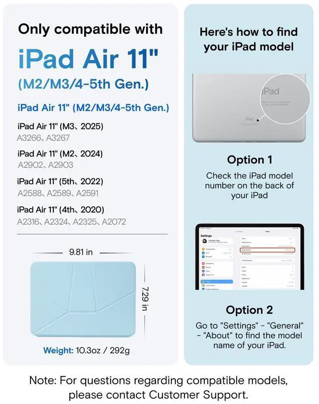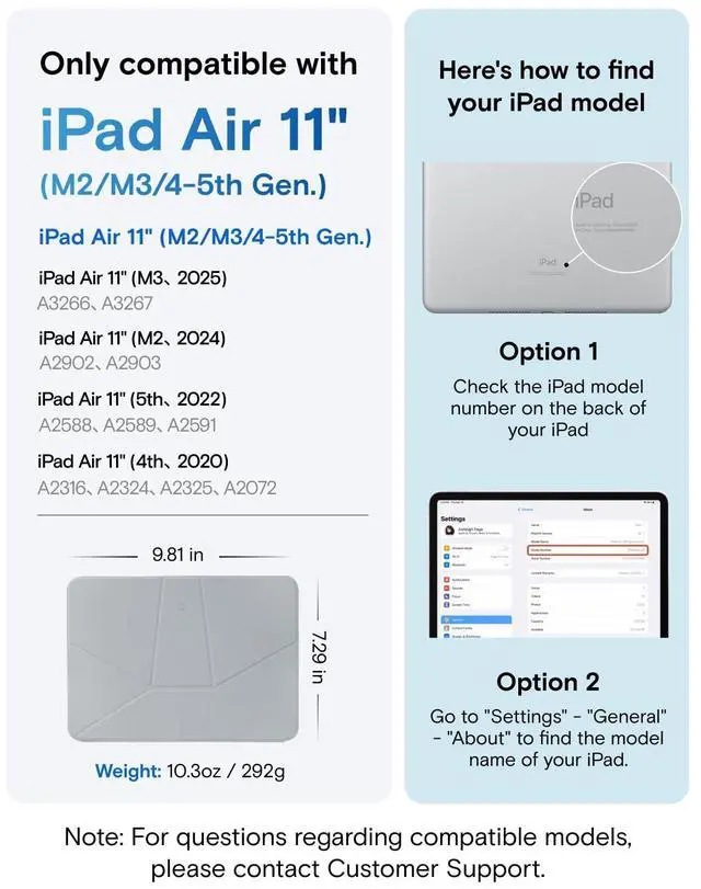 Compatibility - Exclusively compatible with iPad Air 11-inch ( M3 2025 / M2 2024) & iPad Air 10.9-inch 5th 4th Generation 2022 2020 (Model: A3266, A3267, A2902, A2903, A2588, A2589, A2591, A2316, A2324, A2325, A2072), Note: It will not be compatible other model. Please check your iPad model before purchase. For questions about compatible models, please feel free to contact us.
