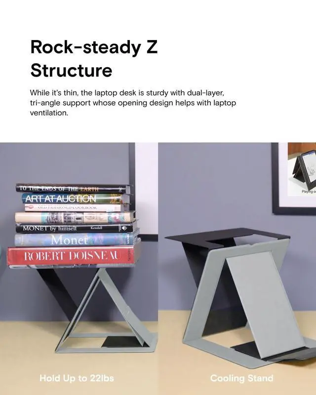 [Magzine-Sized] Its dimensions are 9.4 *11* 0.5 in, so it can be easily stored in a bookshelf without being noticed or a bag before heading out. ^^ [A Standing Workstation] The desk offers a natural height of 10in to raise your laptop, allowing you to work with your palm rested onto the laptop and the screen at eye level. ^^ [Versatile Modes] There are four modes in sitting modes including 25, 35, 45 and 60 for every kind of needs when you sit at your desk, be it comfortable typing, working with peripherals or browsing.