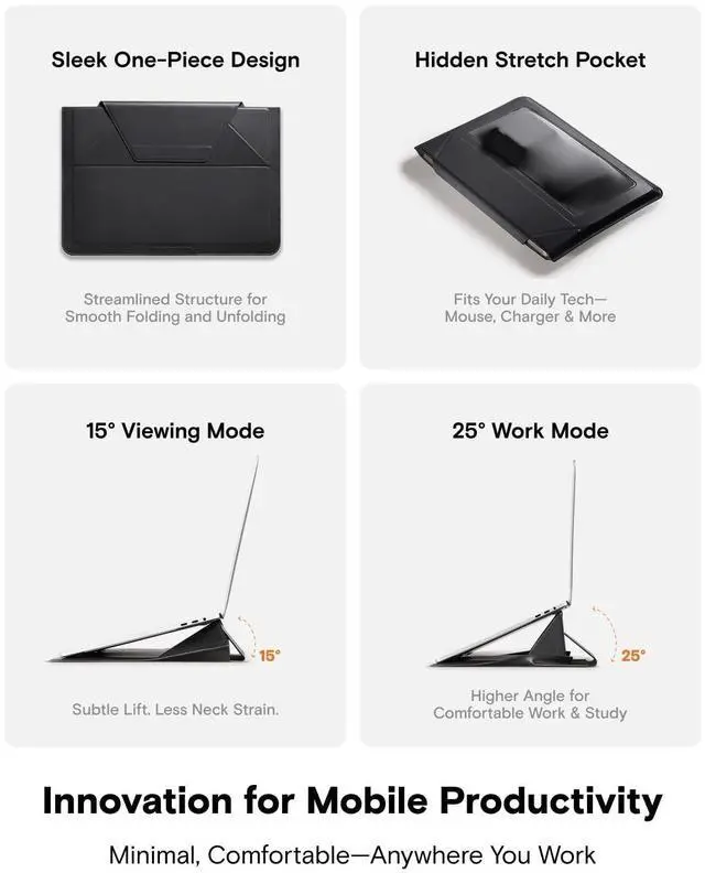Sleeve Stand: Instantly convert this sleek Laptop Sleeve into a sturdy Laptop Stand. Features dual-angle adjustment (15 for typing; 25 for viewing) to elevate your screen, reducing neck/wrist strain from poor posture. More than a protective Laptop Bag, this ergonomic Computer Bag works anywhere transforming your carry sleeve into a pain-relieving workstation.