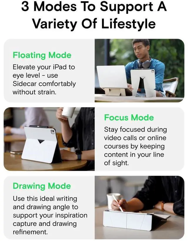Diversify Daily Life: Three stand angles with a 3.1 '' elevation allow the iPad to easily accommodate browsing, drawing, and Sidecar modes. Watch a movie or work using Sidecar at eye level in the Floating Mode, take online courses in the Focus Mode, or sketch in a loose gestural style in the Drawing Mode.
