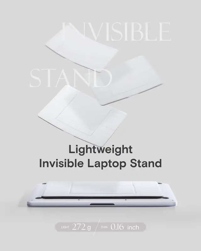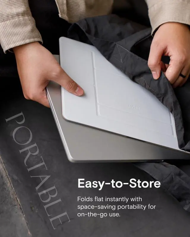[Wide Compatibility] The MOFT Universal Laptop Stand (Large Version) fits more devices from 13+" tablets to 15+" laptops, with ventilation holes to keep a laptop cool. ^^ [Easy to Carry]At 0.16 in thick and weighing 192 g, this portable laptop stand folds flat for easy storage, perfect for travel. Take it with you wherever you go. ^^ [Adhesive-Free, Quick to Set Up]This Non-Adhesive laptop stand takes only several seconds to fold up and adjust, improving your posture whenever you work, play, and read. The foldable laptop stand adjusts to the angle you want to place your laptop, tablet, or book.