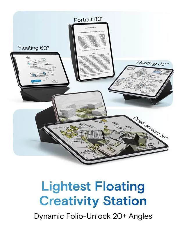 [20+ Dynamic Viewing Angles] Elevate your iPad experience with our patented origami-inspired design. Shifting effortlessly between 20+ adjustable angles, this Dynamic Folio tablet stand meets all your needs from home office tasks to creative sketching. Its the ultimate minimalist workstation that adapts to your multi-faceted life. ^^ [Ergonomic Floating Modes] MOFT tablet holder lift your iPad up to 2 inches for the ultimate eye-level viewing. These unique floating modes reduce neck strain during long study or video editing sessions. Fluidly shift between 30 and 60 to keep your creative flow perfectly aligned, whether you are a developer or a digital artist.