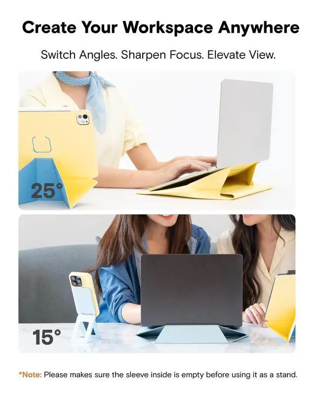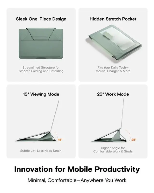 Sleeve Stand: Instantly convert this sleek Laptop Sleeve into a sturdy Laptop Stand. Features dual-angle adjustment (15 for typing; 25 for viewing) to elevate your screen, reducing neck/wrist strain from poor posture. More than a protective Laptop Bag, this ergonomic Computer Bag works anywhere transforming your carry sleeve into a pain-relieving workstation.