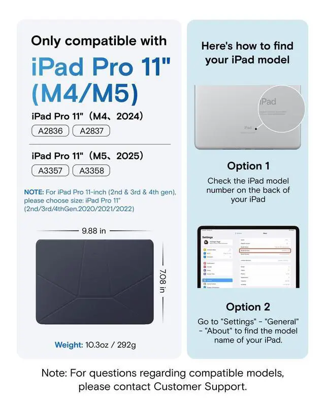 • Compatibility - Exclusively compatible with the iPad Pro 11" (M5 2025/M4 2024)Models A2836, A2837, A3357, A3358.Note: It will not be compatible other model. Please check your iPad model before purchase. For questions about compatible models, please feel free to contact us.