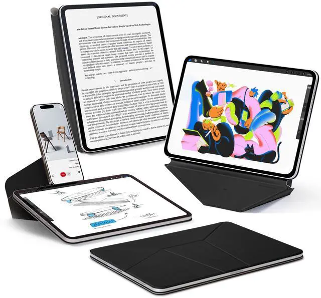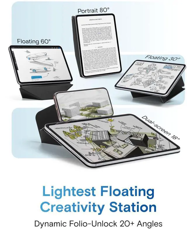 Note: It will not be compatible other model. Please check your iPad model before purchase. For questions about compatible models, please feel free to contact us. ^^ Dynamic Angles, Move with Flow - The Dynamic Folio with 20+ adjustable angles for iPad offers fluid angle adjustments that flow with your every need. Effortlessly shifting from work to creativity, it combines minimalist design with versatile functionality, enhancing your dynamic lifestyle. ^^ Ultimate Ergonomic Floating Modes - MOFT Dynamic Folio Case makes iPad ergonomics effortless for mobile creativity - featuring a single-piece structure that effortlessly folds into a workstation lifting iPads up 2-inches. Frictionless angle shifts between 30 and 60 keep you aligned in your input-output framework. ^^ As Light As 14oz - Like a thin yet powerful sheet of paper wrapping around your iPad, this folio offers effortless protection and versatile angles - perfect for any scene without the added bulk, all at just 14oz. ^^ Magnetic Flexibility - Effortlessly adjust angles and elevate your device with confidence. Super-strong N52 magnets provide secure support, while the lightweight yet durable fiberglass structure ensures stability.