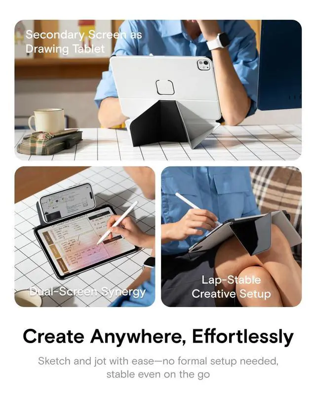 Every Moment: This versatile tablet protector is designed for every scenario. With 20+ adjustable angles, it perfectly adapts to your daily needswhether you're streaming movies, joining online meetings, working from home, sketching, creating on your iPad. From professional tasks in the office to creative sessions in a cafe or following recipes in the kitchen. it is the essential all-in-one companion for both productivity and leisure.