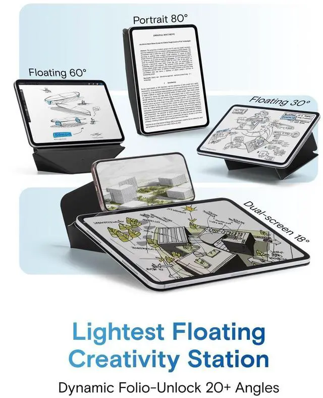 • [20+ Dynamic Viewing Angles] Elevate your iPad experience with our patented origami-inspired design. Shifting effortlessly between 20+ adjustable angles, this Dynamic Folio tablet stand meets all your needs from home office tasks to creative sketching. Its the ultimate minimalist workstation that adapts to your multi-faceted life.