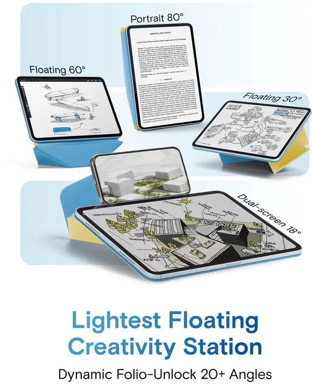 Note: It will not be compatible other model. Please check your iPad model before purchase. For questions about compatible models, please feel free to contact us. ^^ Dynamic Angles, Move with Flow - The Dynamic Folio with 20+ adjustable angles for iPad offers fluid angle adjustments that flow with your every need. Effortlessly shifting from work to creativity, it combines minimalist design with versatile functionality, enhancing your dynamic lifestyle. ^^ Ultimate Ergonomic Floating Modes - MOFT Dynamic Folio Case makes iPad ergonomics effortless for mobile creativity - featuring a single-piece structure that effortlessly folds into a workstation lifting iPads up 2-inches. Frictionless angle shifts between 30 and 60 keep you aligned in your input-output framework. ^^ As Light As 10.3 oz - Like a thin yet powerful sheet of paper wrapping around your iPad, this folio offers effortless protection and versatile angles - perfect for any scene without the added bulk, all at just 10.3 oz. ^^ Magnetic Flexibility - Effortlessly adjust angles and elevate your device with confidence. Super-strong N52 magnets provide secure support, while the lightweight yet durable fiberglass structure ensures stability.