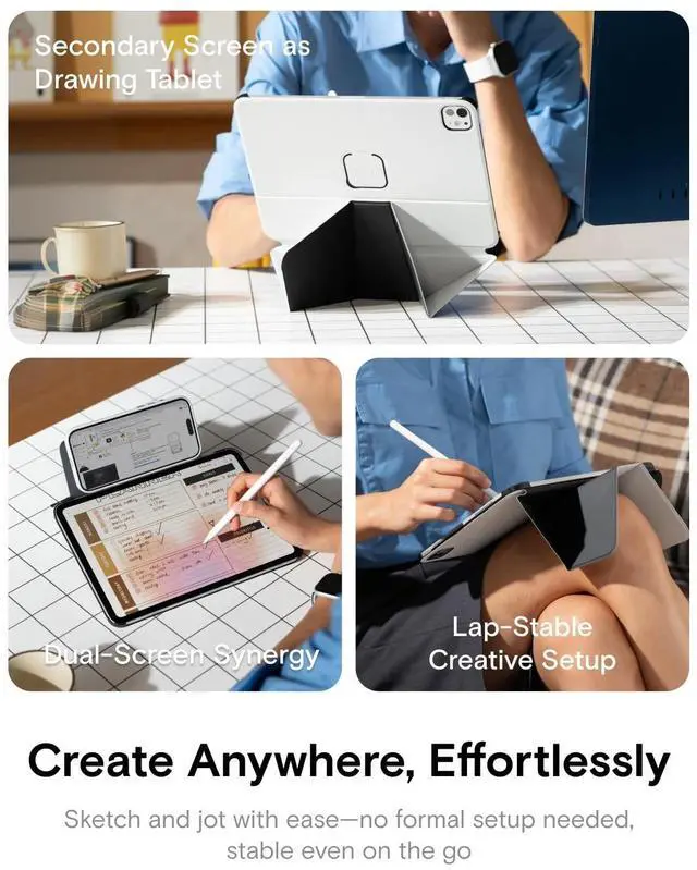Every Moment: This versatile tablet protector is designed for every scenario. With 20+ adjustable angles, it perfectly adapts to your daily needswhether you're streaming movies, joining online meetings, working from home, sketching, creating on your iPad. From professional tasks in the office to creative sessions in a cafe or following recipes in the kitchen. it is the essential all-in-one companion for both productivity and leisure.