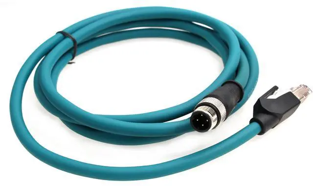 • M12 4pin D-code RJ45 E4 Plug ETHERNET Cable is a single foil twisted pair cat5e cable with a blue PUR jacket rated at 24 AWG wire M12 Connector with gold plated 4 pin coded contacts ensure reliable connectivity