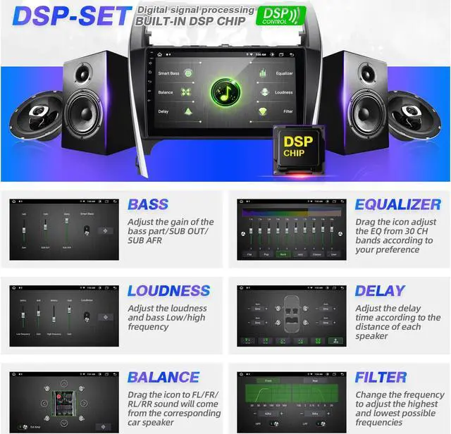 DSP digital processing audio streaming:Built in DSP sound effect processing chip, It supports 6 sound settings Smart Bass, Balance, Emperor, 30-EQ, Loudness, Filter, equipped with TDA78388 power amplifier chip, customize the best sound in different positions according to your preferences to meet your personalized needs,and bring you a pleasant driving journey.