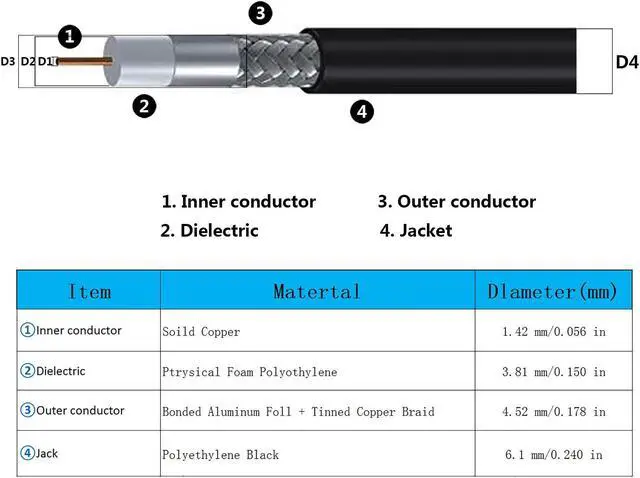 - Coax: Double shielded Low-loss S-MR240 size ( 0.240 inch diameter)