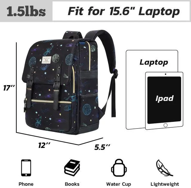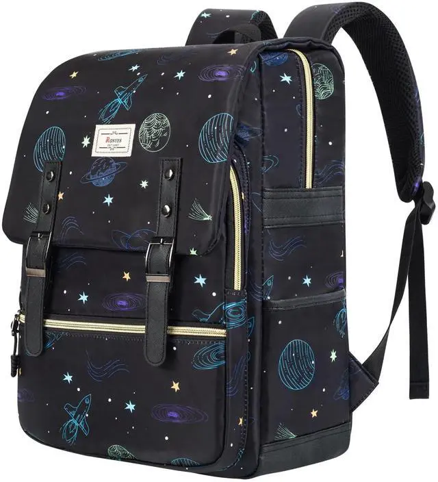 Ronyes Vintage Backpack for Women Men, Laptop Backpack 15.6 inch Bookbag Casual Daypack for Work, Black with Rocket Pattern