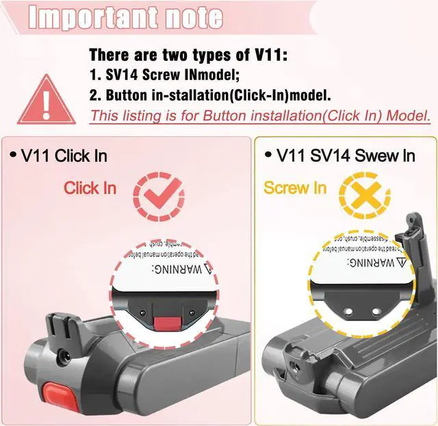 NOTE for V11 SV15 Click-in BatteryThere comes two types of V11 Models: Click-in and Screws-in. These listing we are selling is for V11 V15 Click-in Battery,Not for (V11 SV14 Screw-in) series or V12 series.Please double check your orignal vacuum battery model before placing the order.