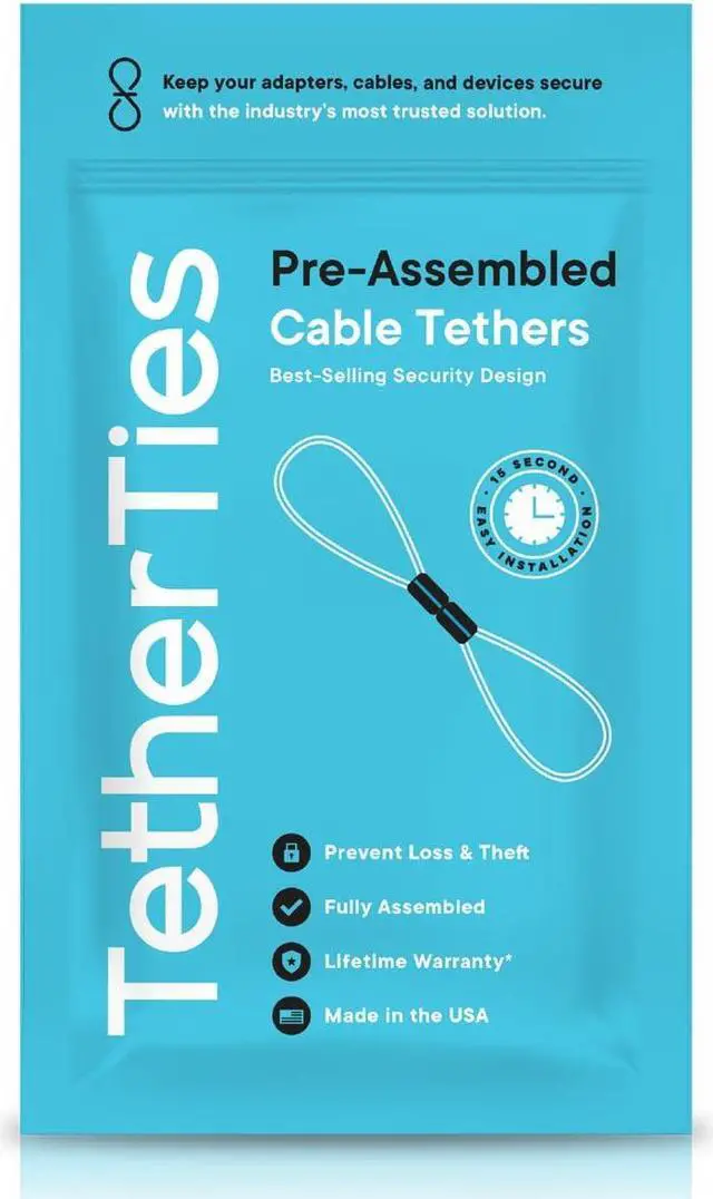 AMERICAN MADE QUALITY TetherTies are made in the USA with high-quality stainless steel wire, featuring a flexible, nylon-coated design. This durable solution keeps your computer, adapters, and dongles secure with a minimalist design.