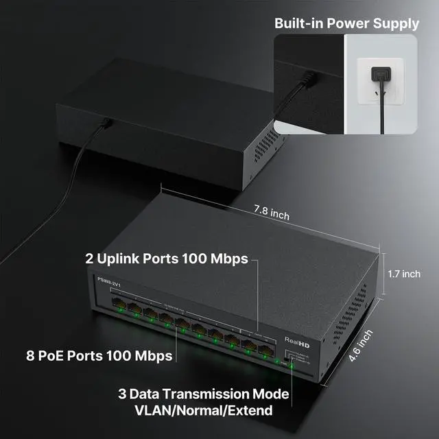 8 PoE+ Ports and 2 Ethernet Uplink Ports at 10/100Mbps each, making network setups easier and more convenient.