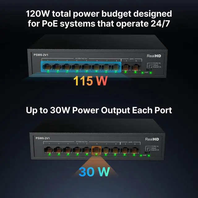 Real HD 10 Port PoE Switch, 8 Ports PoE+ 2 Uplink Unmanaged 100Mbps Switch, High Total Power Budget 120W, 802.3af/at Compliant, Work with IP Cameras VOIP Phones