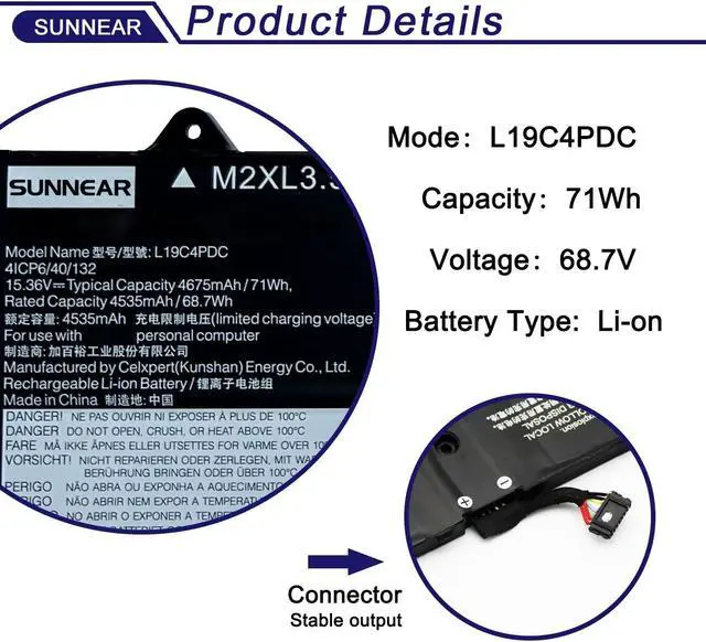 SpecificationsModel: L19C4PDC Voltage: 15.36V Capacity: 71Wh/4675mAh Battery type: Li-ion. Also comes with installation tools