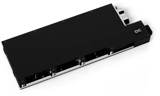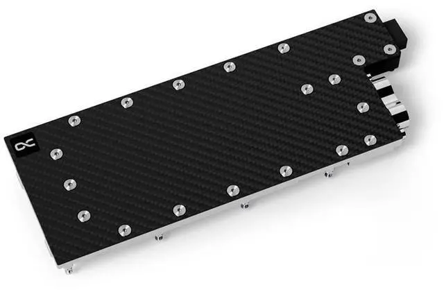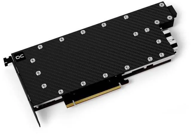 The Alphacool ES Copper/Carbon water cooler with backplate was specially developed for the Alphacool Enterprise Series. The positioning of the connections significantly simplifies the tubing of the cooler in the server rack. The cooler top is made of carbon and makes the water cooler lighter compared to Alphacool's ice blocks with acetal or acrylic tops. Thanks to the compact design, the cooler only needs 1 slot in the server rack instead of the previous 1.5 slots, which offers additional space savings and makes the use of the ES Copper/Carbon GPu water cooler even more attractive.