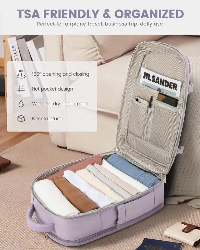 Airline Approved & TSA Friendly : Experience stress-free air travel with our carry on backpack. Measuring 14" x 8.3" x 18.5", it fits comfortably in overhead bins and under the seat. Designed for quick security checks, it opens 180 degrees, making it the perfect travel companion for your journeys.