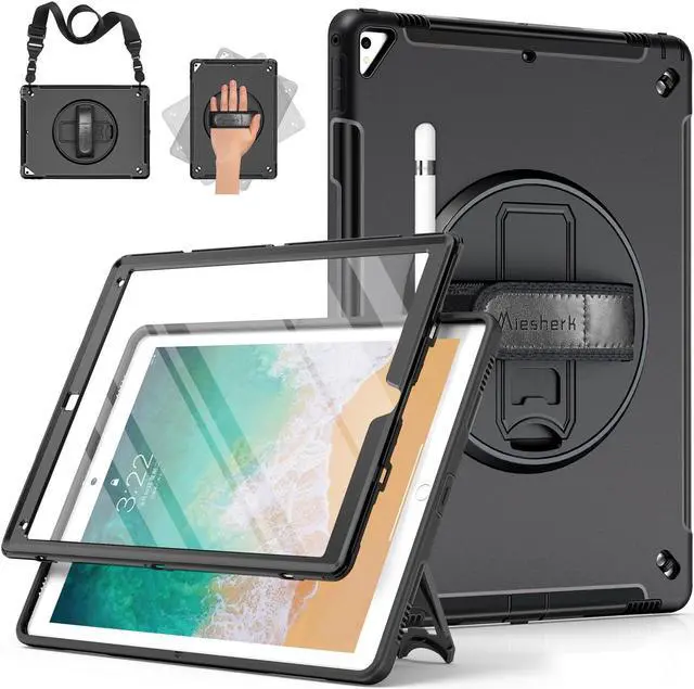 Miesherk Case for iPad Pro 12.9 2nd Generation 2017 & 2015 1st Generation, Heavy Duty Rugged Shockproof Protective Cover w/360°Rotating Stand/Hand/Shoulder Strap/Pencil Holder Black