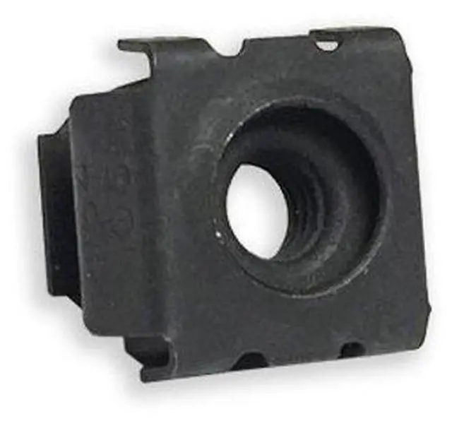 The RackGold Cage nuts snap into square hole rack rails, giving you various threading options such as 10-32, 12-24, M5 or M6. Dell servers typically use 10-32 style threading, Compaq most often use M6 threads. Most telco 2-post relay racks use 12-24 threads. The nut is housed within a 3/8 inch spring metal body. When each side tab on the body is compressed, the nut can be inserted into the square hole in the rack rail. Most often used for mounting of servers, rack shelves, switches, routers, and other networking, electronic and data equipment.