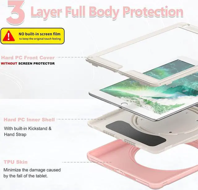 Built-in three-layer protection: Advanced 3-in-1 structure, using high-quality PC and shock-absorbing TPU materials, provides comprehensive protection for your tablet, effectively preventing it from accidental fall, vibration, sliding and scratches. Dont worry about your iPad slipping from your childs hand and breaking. No need to remove the shell to fully access all ports, buttons and cameras.