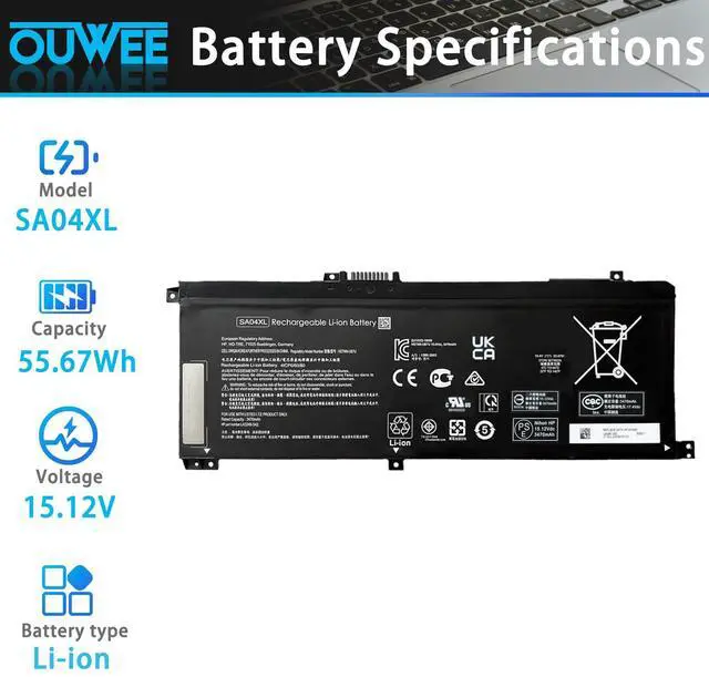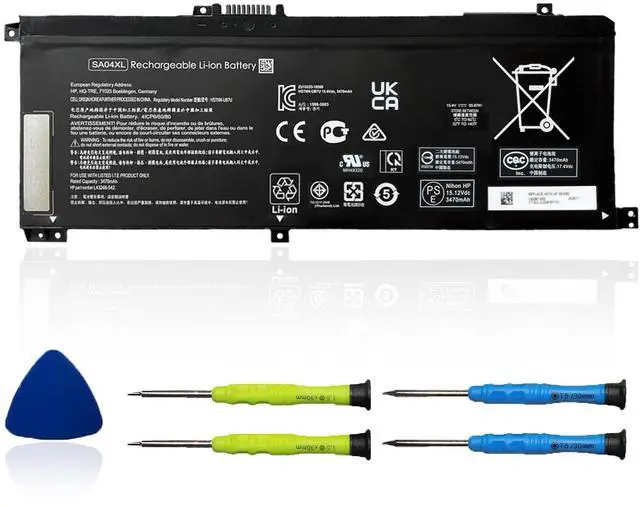 Specifications SA04XL battery for hp envy x360 Replacement Battery, Type: Li-ion; Our SA04XL Battery Replacement for HP 55.67wh Standard SA04XL Rechargeable li-ion battery. Voltage: 15.12V; Capacity: 55.67Wh 3470mAh . Cells:4 cells; Color: Black;Condition: New; Battery lasts: 3-6 hours, Packages includes: 1x SA04XL Battery,2 x Free Screwdrivers,1x Instruction for Laptop battery