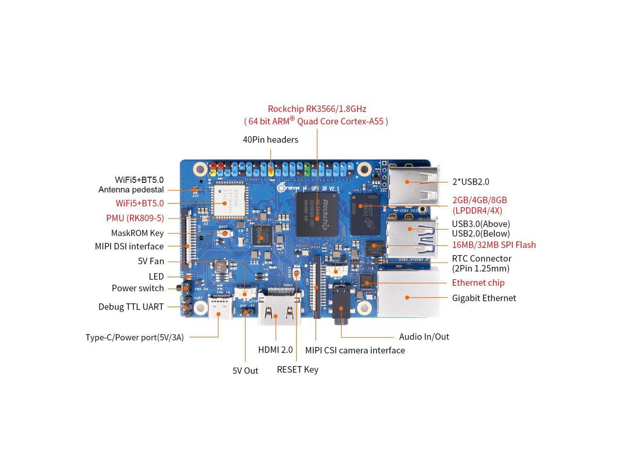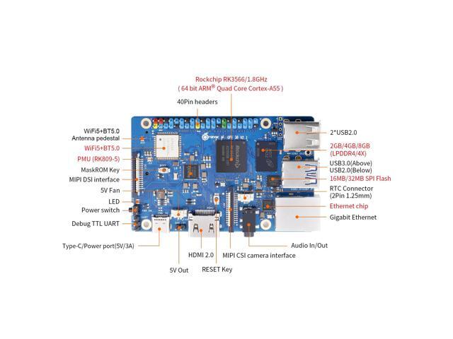 [High Performance] - Orange Pi 3B 8G is powered by Rockchip RK3566 quad-core 64-bit processor with 22nm advanced process, up to 1.8GHz main frequency, integrated ARM Mali G52 2EE graphics processor with OpenGL ES 1.1/2.0/3.2, OpenCL 2.0, Vulkan 1.1 support, embedded high-performance 2D acceleration module.