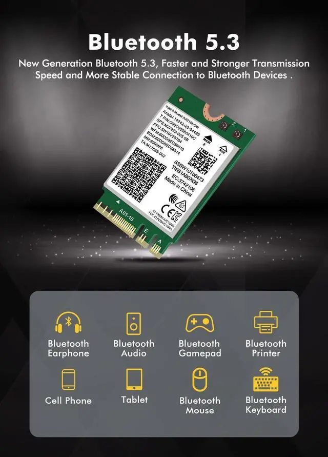 AX210 NGW Wireless LAN CardProvides tri-band (6GHz, 5GHz and 2.4GHz) signal. Maximum speed up to 5374Mbps(2400Mbps @6GHz + 2400Mbps @5GHz + 574Mbps @2.4GHz).