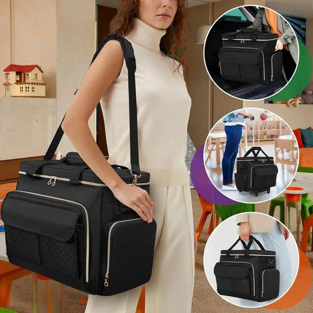 Rolling Teacher Bag: Attached with sturdy top handles, a detachable dolly and a detachable shoulder strap. There are also 2 side padded handles for lifting the bag easily.