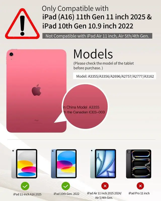 Compatibility: This keyboard case ONLY designed for the new iPad A16 2025 11th Generation 11 Inch(Model Number: A3354 A3355 A3356)/iPad 10th Generation 2022 10.9 inch(Model Number: A2696 A2757 A2777). Note: It will not be compatible with other iPad Models. Please check the model number starting with "A" on the back of your iPad before purchasing