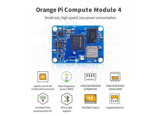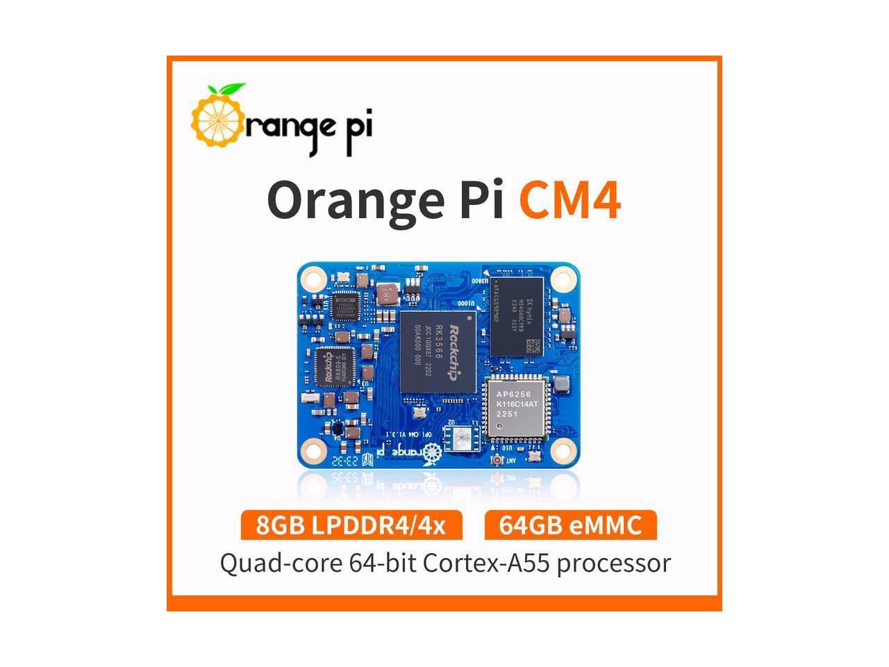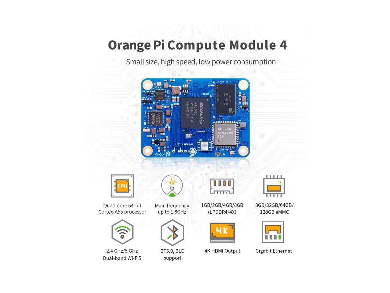 - [Compact and Powerful]: Orange Pi Compute Module 4, featuring the Rockchip RK3566 quad-core 64-bit Cortex-A55 processor. Built on a 22nm process, it runs up to 1.8GHz processor. And Orange Pi CM4 is available with four high-performance memory configurations (1GB, 2GB, 4GB, and 8GB) and multiple eMMC flash memory options (8GB, 32GB and 64GB).