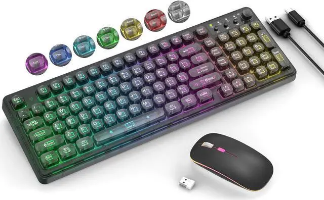 Transparent keyboard with shining keycaps The wireless transparent keyboard is made of special ABS material, modern 99 transparent keycaps will cause a typical reflection and increase the effect of the keyboard glowing,you can feel the beautiful light more clearly,make your keyboard be unique in your office. The cute keyboard with square keycaps provide a larger typing surface to help get a better and more clear typing experience.