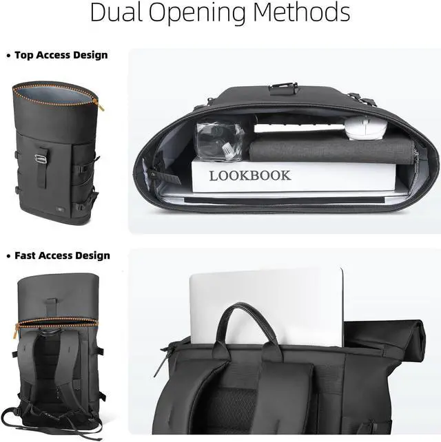 [Two Ways For Quick Pickup] Featuring two ways to access the main compartment, this expandable backpack offers both a top zipper and a quick-access rear zipper. When the roll-top is fastened, the back zipper lets you reach into the main compartment without undoing the metal bucklemaking it quick, stylish, and efficient for people on the go.