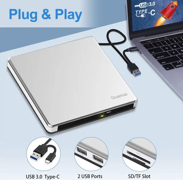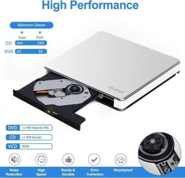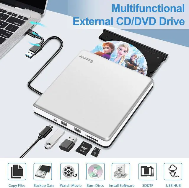 External CD/DVD Drive for LaptopSince most of the latest laptops and desktops computers no longer comes with built-in CD/DVD drives, this Guamar external DVD drive provides an excellent solution for reading, writing and ripping CD and DVD discs. You can use this CD burner to burn files,rip CDs & DVDS, install software and create backup discs. Watch DVD movies with no lag and burn music,movies to CD or DVD at any time