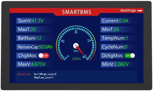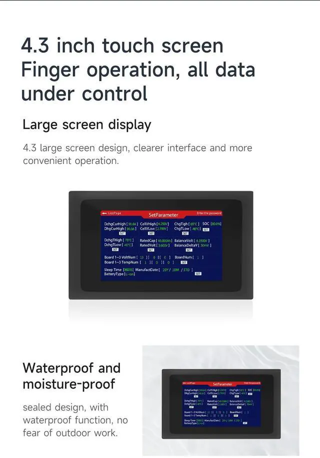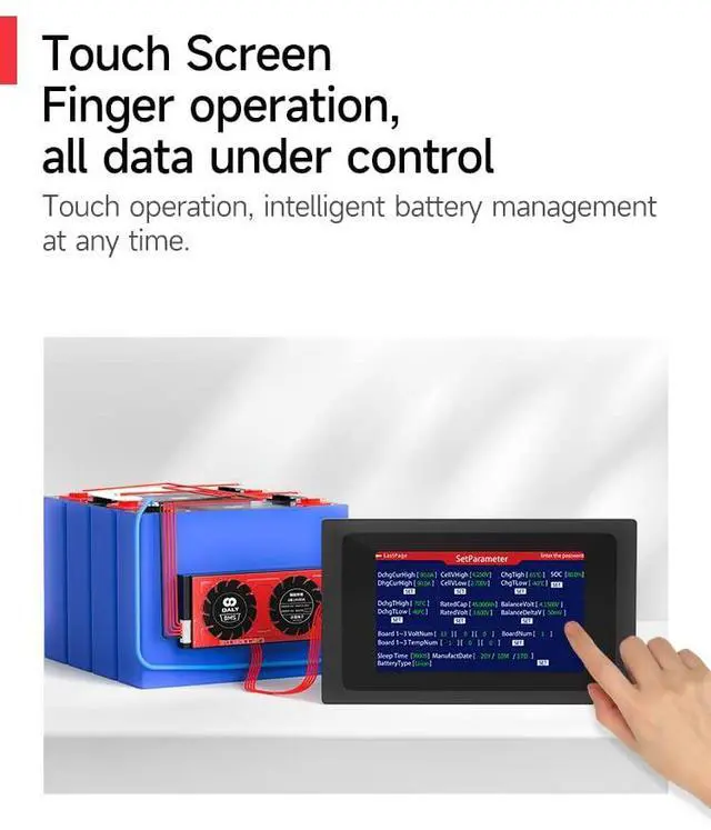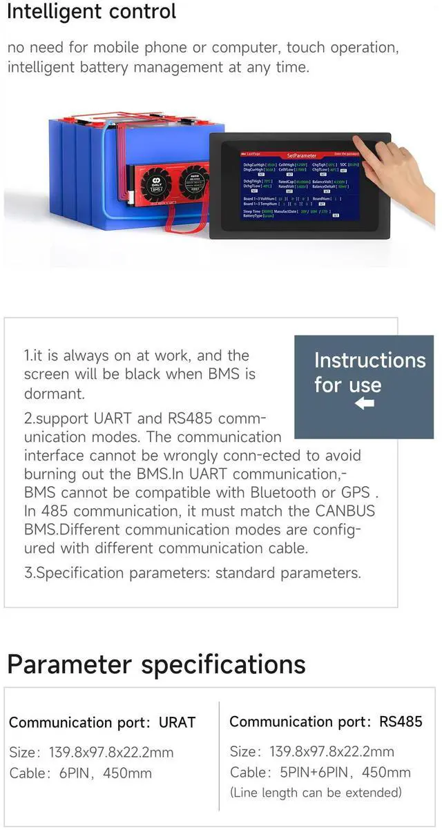 Instructions For Use: (1) It is always on at work, and the screen will be black when BMS is dormant. (2) Support UART and RS485 communication modes. The communication interface cannot be wrongly conn-ected to avoid burning out the BMS. In UART communication, BMS cannot be compatible with Bluetooth or GPS. In 485 communication, it must match the CANBUSBMS. Different communication modes are configured with different communication cable.