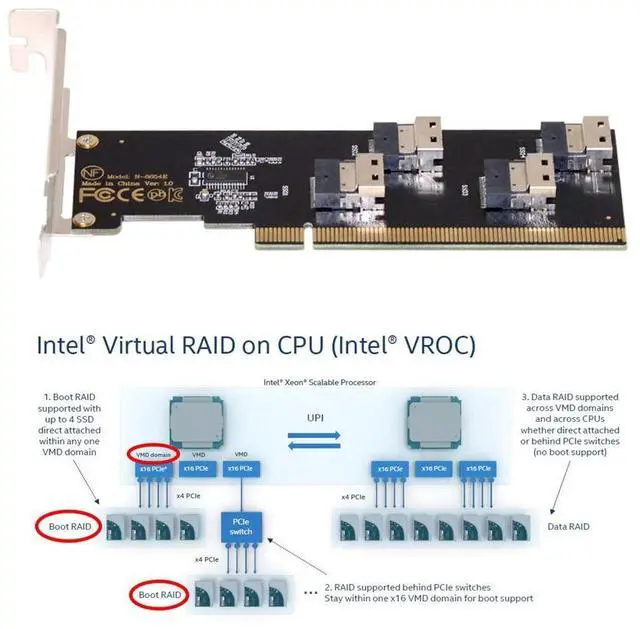 Four Slimline SFF-8654 4X 4 NVME to PCIE Express 3.0 4.0 Raid Card VROC Raid0 Hyper Adapter