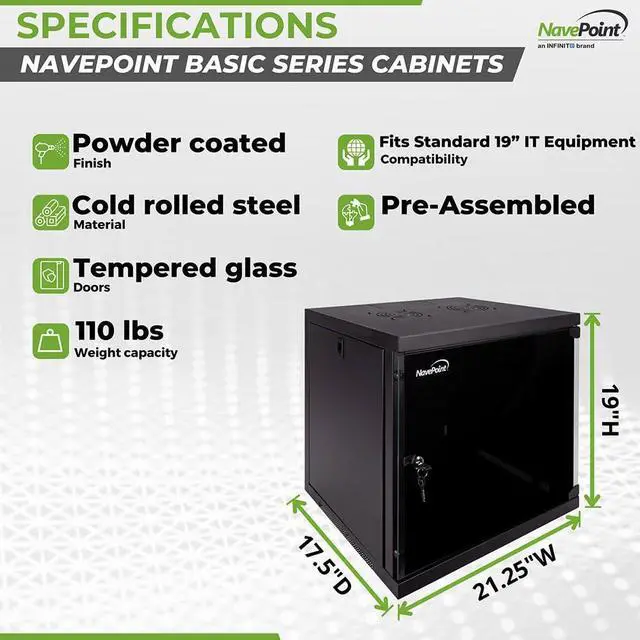 DURABLE - Engineered with high-grade cold-rolled steel, the NavePoint Basic Series 9U cabinet excels in strength and longevity. Its welded frame design and black powder coating offer resistance to wear, maintaining integrity even under demanding IT conditions. This sturdy construction supports up to 110 lbs of equipment, providing lasting reliability for your infrastructure.