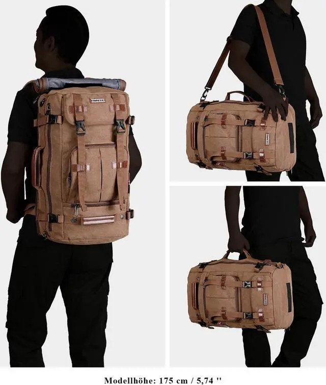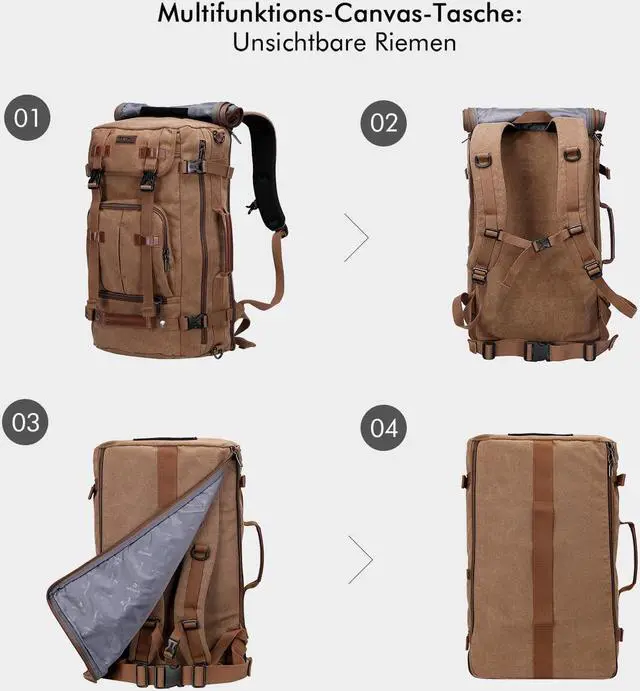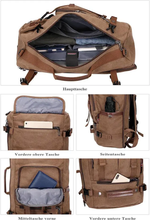 Convertible Backpack : This canvas travel backpack can be used as backpack, tote bag, and crossbody bag with a shoulder strap; And there is a zipper pocket on the backside that you can hidden the backpack strap when you carry this bag as tote bag or crossbody bag. Without puzzle of having those backpack strap hanging freely.