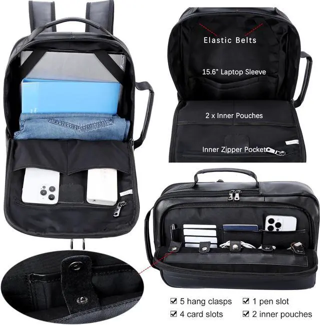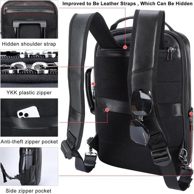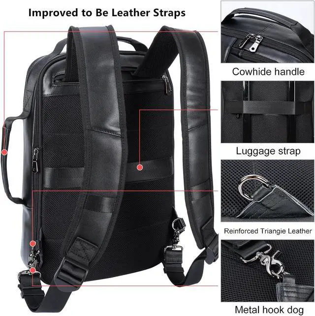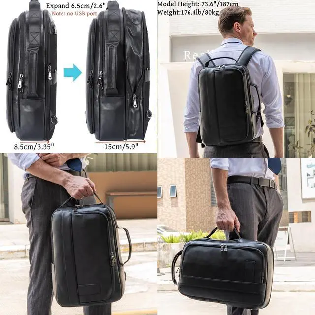 Expandable BackpackYou can expand the black leather laptop bag wider about extra 6.5cm/2.6". Roomy to store 15.6 inch laptop,A4 files, tablet, telephone, pens, cards, wallet, clothes. Size:11.4"(L)x3.35"(W: before expasion) / 5.9"( W: after expansion) x 16.5" -17.7"(H); Weight:1.43 kg/3.15 lb, Shoulder Strap Length:65-103cm/25.6"-40.6". Strap type: adjustable and hiddable into back zipper pocket.