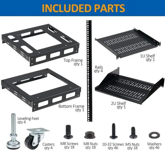 [All Inclusive]: Including 4pcs of casters, 4pcs of leveling feet, 1pc of 1U vented shelf (16 depth), 1pcs of 2U vented shelf (18 depth) and other accessories required for rack installation.