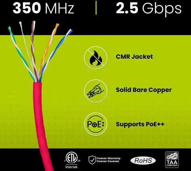 [High Performance Network Cable] This riser rated cat 5e cable is 24 AWG with 4 pairs (8 conductors). Suitable for 1 and 2.5 Gigabit (2.5GBASE-T) speeds up to 328 feet. Bandwidth tested up to 350 MHz. Supports Power over Ethernet: PoE/PoE+/PoE++ (IEEE 802.3af/at/bt) 4PPoE up to 100W.