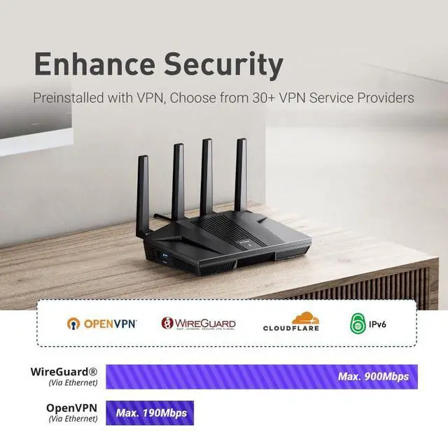 Rapid OpenVPN & Wireguard speedFlint 2 offers Wireguard VPN and OpenVPN speeds up to 900Mbps and 190Mbps respectively, giving you complete control over your gaming, streaming and working bandwidth. Actual speed may differ depending on internet service provider, network environment, VPN server location, VPN service provider, etc.
