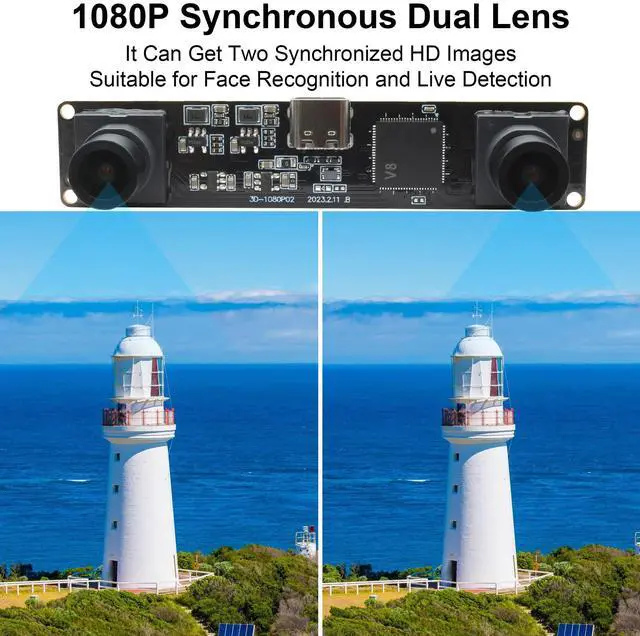 Synchronous Dual LensThis camera module has two lenses so you can get two synchronised HD images. It is suitable for indoor face detection and live detection. Functions such as face template capture and face comparison can be realised.
