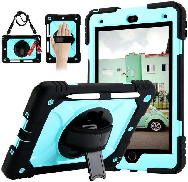 for iPad 9th/8th/7th Generation Case, iPad 10.2 Case 2021/2020/2019, with Cute Key Chain, Rugged Protective Case with 360°Rotating Stand & Shoulder Hand Strap & Pen Slot for 10.2 Inch (Black+Aqua)