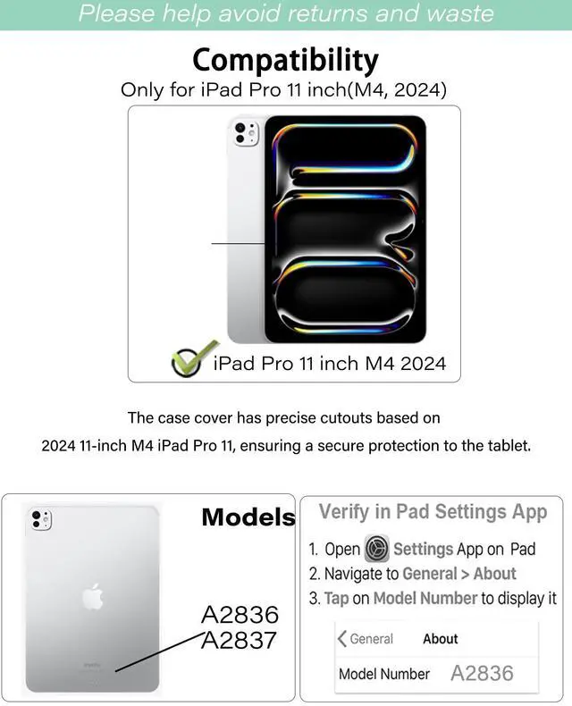 Compatibility: This case features precise cutouts designed for the iPad Pro 11-inch(5th Gen). Therefore, it is ONLY compatible with the 2024 M4 iPad Pro 11 inch with model numbers 2024 5th Gen (A2836, A2837). Please hlep to avoid returns and waste, kindly verify compatibility by checking at the back of your iPad or navigating to Settings > General > About. Note: Not for iPad Air 11 inch(M2, 2024)