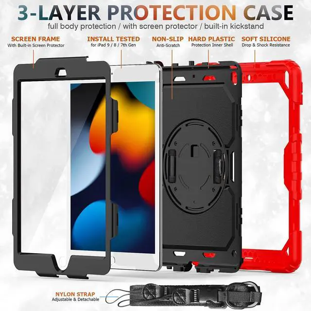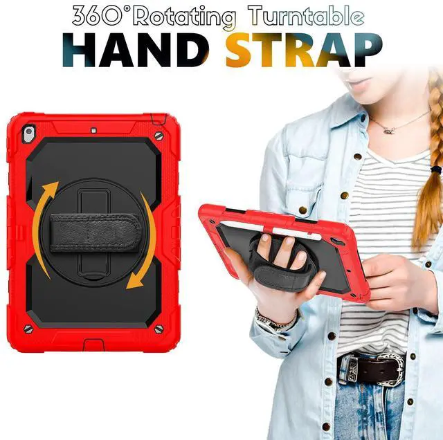 TSQ Case for iPad 9th/8th/7th Generation 10.2 Inch 2021/2020/2019 w/Screen Protector Pencil Holder Stand Hand Strap ^^ Heavy Duty Rugged Cover Case for iPad 9th 8th 7th Gen for Kids ^^ Black+Red