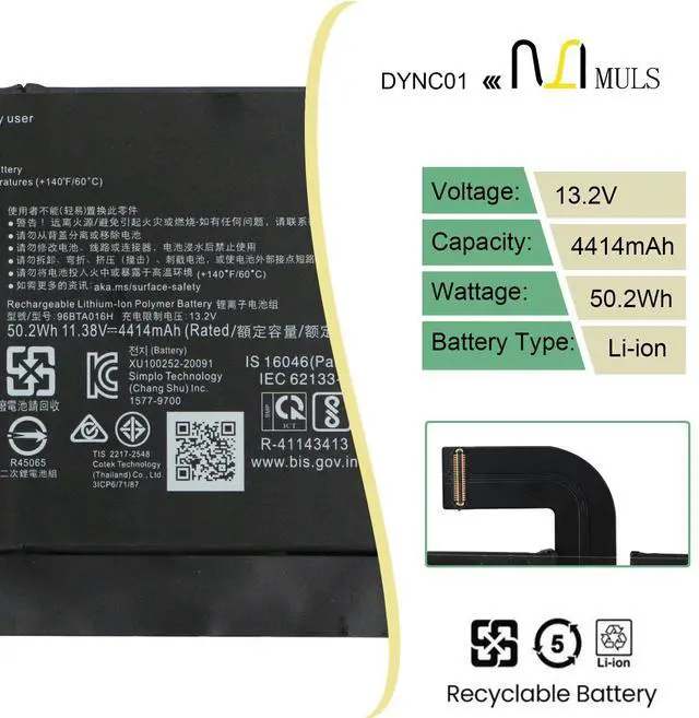 MULS 96BTA016H DYNC01 Laptop Battery for Microsoft Surface Pro 8 1983 1982 Tablet PC 13.0 Core i5-1145G7 Ultra-Thin Detachable 2-in-1 Business Laptop Touchscreen 96BTA015H 50.2W h 4414mAh